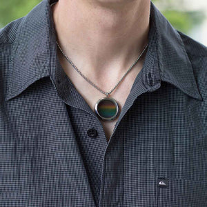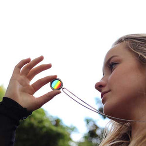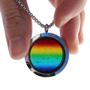 As a symbol of sunlight, we have microprinted the solar spectrum on a translucent disc within a steel and glass locket. When worn, it looks like a silver pendant with a dark interior, matching everything. But when you hold it up to the light, you see a magnificently detailed rainbow with tiny black lines representing the chemical makeup of our sun. The spectrum image used here was created by N.A.Sharp at the Fourier Transform Spectrometer at the McMath-Pierce Solar Facility at the National Solar Observatory on Kitt Peak. Credit and thanks to: NOAO/NSO/Kitt Peak FTS/AURA/NSF. The pendant comes on your choice of an 18 inch steel chain or a longer 26 inch steel chain.