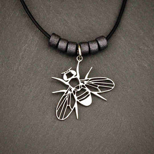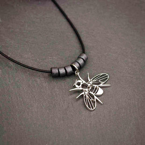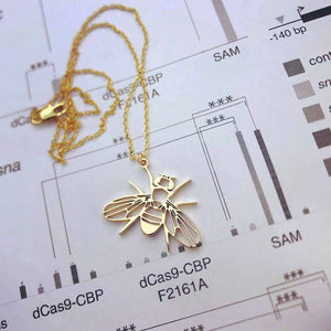This necklace highlights the most recognizable aspects of Drosophila, making it a unique piece of science-inspired jewelry. From the beautiful wing pattern to the distinctive stripes, this pendant is delightfully accurate. The Drosophila pendant is made from plated steel (lead-free and nickel-free). It measures 3cm wide and about 2.5cm tall. The pendant comes on an 18 inch stainless steel or gold plated chain.