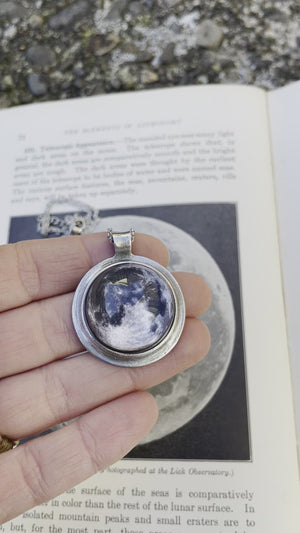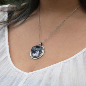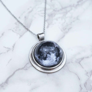 This pendant encases an archival-quality print of the moon under a 1 inch glass dome. The reflection of the dome gives the moon a three-dimensional feel. The metal in the pendant is a hand-finished pewter (nickel-free, lead-free). The pendant comes on your choice of a steel chain, sterling silver chain, or adjustable leather cord.