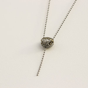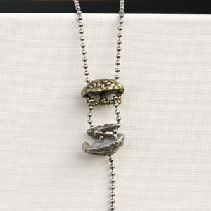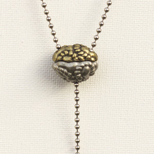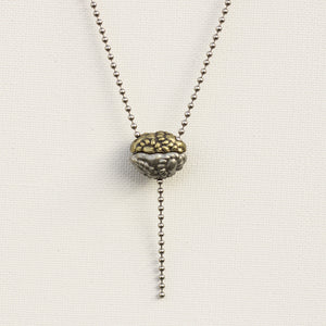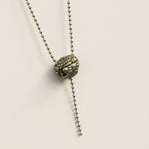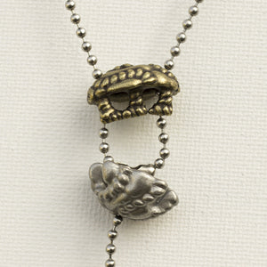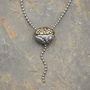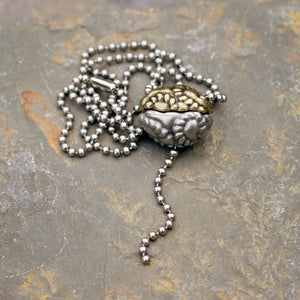 Every aspect of this pendant's design has significance. It is cast in two parts from lead-free nickel-free pewter, representing the large and small subunits of the ribosome. The small subunit can be lifted to reveal transfer RNA (tRNA) molecules within, as they link amino acids to the growing polypeptide (represented by a length of chain extending from the bottom of the ribosome). The 18-inch steel ball chain from which the pendant hangs represents a strand of messenger RNA (mRNA), entering and exiting the ribosome through channels in its small subunit.