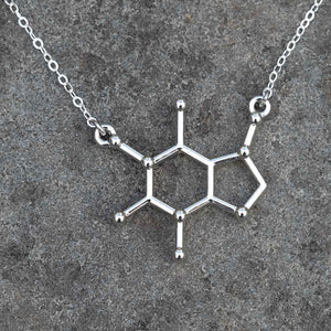 Coffee lover? Dark chocolate? Green tea? Whatever happens to be your caffeine delivery system of choice, this cute caffeine necklace will be a conversation starter. The caffeine molecule is hung from an 18 inch sterling silver chain, with or without a dangling cup charm attached. The caffeine molecule is a lead-free, nickel-free zinc alloy and the cup is made from Tibetan silver.