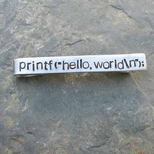 Most tie bars don't compile...but this one does! Here is a "hello, world" program in C that we've had hand-stamped on a beautiful tie bar. Great as a gift or just to say, "You had me at 'Hello, world'."