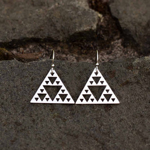 These earrings come in your choice of silver colored polished steel on steel hooks, or gold colored polished steel on gold colored steel hooks. You may also choose the orientation which appeals most to your eye: point up (the traditional Sierpinski Triangle representation)...or point down (adding a touch of Modern Art Deco flair).