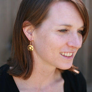 The earrings are gold or rhodium plated and measure ~3/4". (Rhodium is a non-tarnishing silver colored precious metal.) They are slightly domed for depth and are hung on gold-filled or stainless steel hooks.