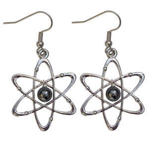 These carbon atom earrings make a delightful statement in support of science. A dark grey Swarovski pearl on a hand-wrapped silver wire makes the nucleus, and the 1 1/4" atoms are hung from stainless steel french hooks. From t-shirts to formal dresses, these earrings will add that extra "Hooray, science!" touch in the very best way.