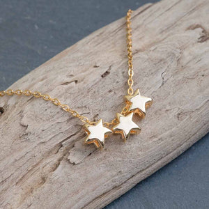 Fancy enough for special events and simple enough for daily wear, this necklace matches everything with its three delicate gold or rhodium plated star-shaped charms dancing cheerfully on an 18 inch gold plated or sterling silver chain.