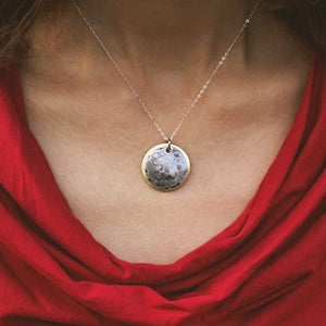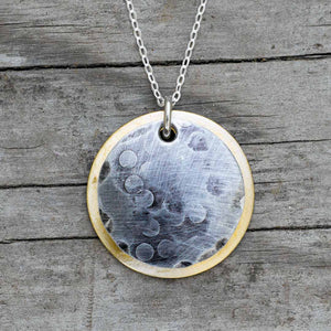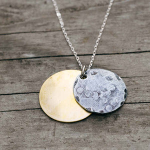 This beautiful, hand-crafted pendant is a subtle and elegant reminder of our sky's most stunning spectacle. The "moon" is made from a heavily hammered, antiqued silver aluminum disc. Behind is a lightly weathered brass "sun".