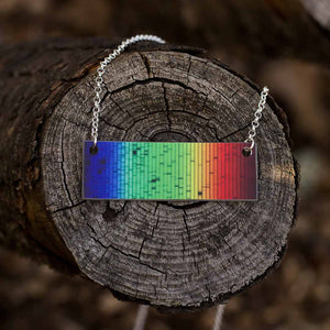 As a symbol of sunlight, we have used an innovative jewelry technique to create this beautiful solar spectrum bar necklace. The spectrum image used here was created by N.A.Sharp at the Fourier Transform Spectrometer at the McMath-Pierce Solar Facility at the National Solar Observatory on Kitt Peak. Credit and thanks to: NOAO/NSO/Kitt Peak FTS/AURA/NSF. The tiny black lines represent the chemical makeup of our sun... like the fingerprint of our closest star.
