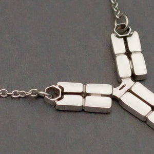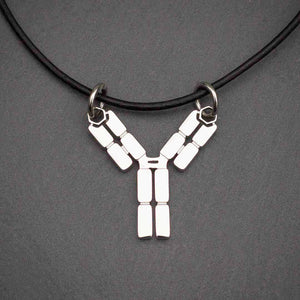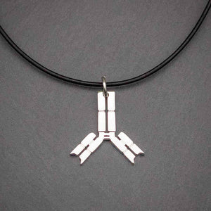 If you look closely, the polished steel antibody pendant displays the antigen binding site, the interchain disulfide bonds, the hinge region, the Fab fragment, and the Fc region. In the pendant style that looks like a right-side-up "Y", the chain is attached to tiny antigens at the antigen binding site.