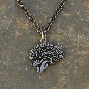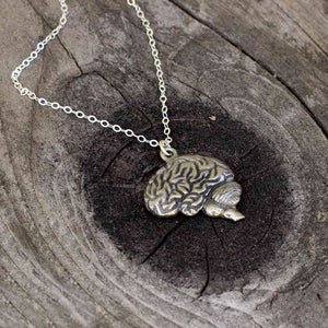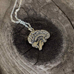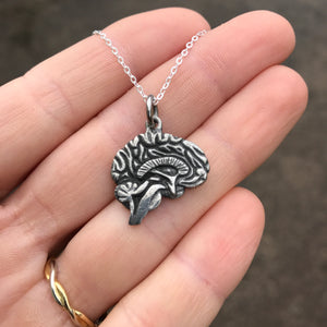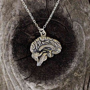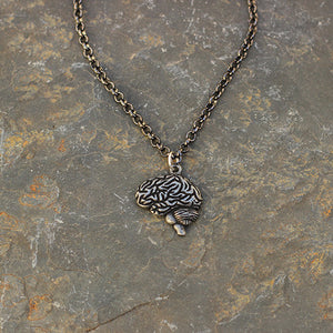 We all have a brain, but now you can have two! Or one and a half, if you want to be exact. This delightful hemisphere was cast in solid pewter from a hand carved model. The pendant is two-sided, so you can decide which faces out. It measures about 3/4" square (20mm) and is hung on a 24" gunmetal chain or an 18" sterling silver chain. Using the greatest attention to detail, it displays a wide range of brain features, including the: corpus callosum, thalamus, hypothalamus, medulla oblongata, cerebellum, brainstem... and more.