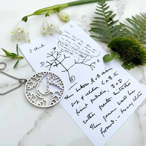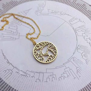 All life is connected, and this pendant represents the entirety of our Earth-bound biological extended family. A phylogenetic tree is a diagram that shows the evolutionary relationship between species. Every form of life on earth comes from common ancestry, which you can see as the tiny vertical line in the center of the pendant. Each branch extending outward represents a split in the evolutionary path. The little circle on the right side of the pendant shows where humans reside in the diagram... like a "You Are Here" dot marking our place in evolutionary history.