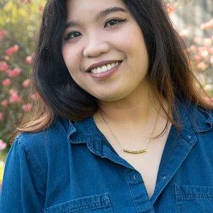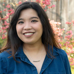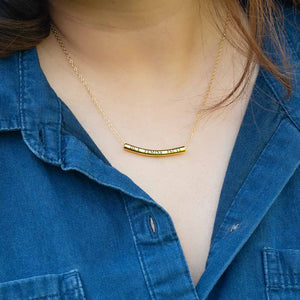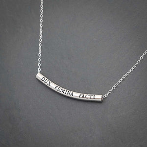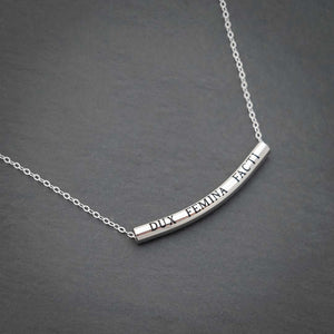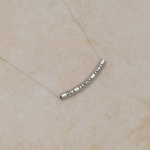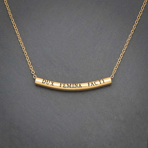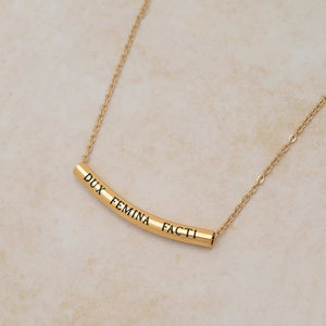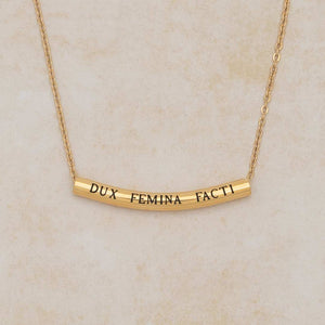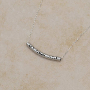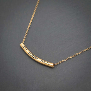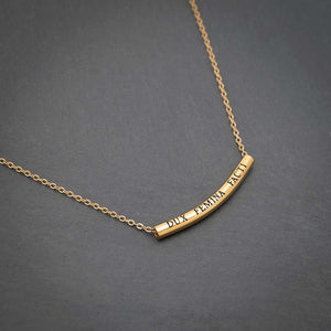 The pendant is made from gold or silver colored steel, and has the phrase engraved on one side. The lettering is subtle and the pendant can be worn either with the phrase facing outward or towards the heart. It uses an elegant, minimalist style that works well in both dressy and casual settings.