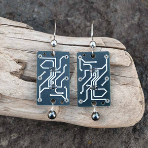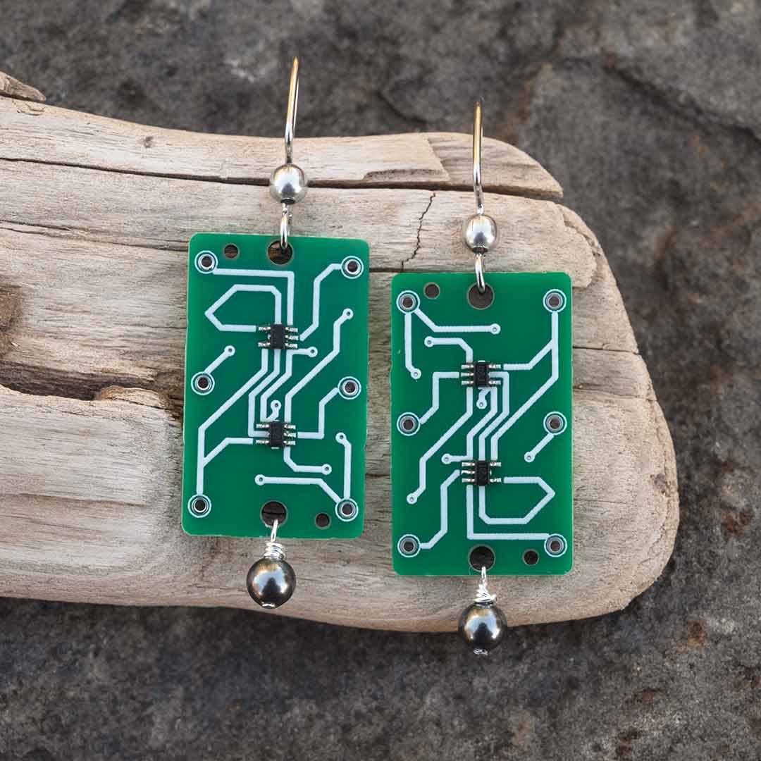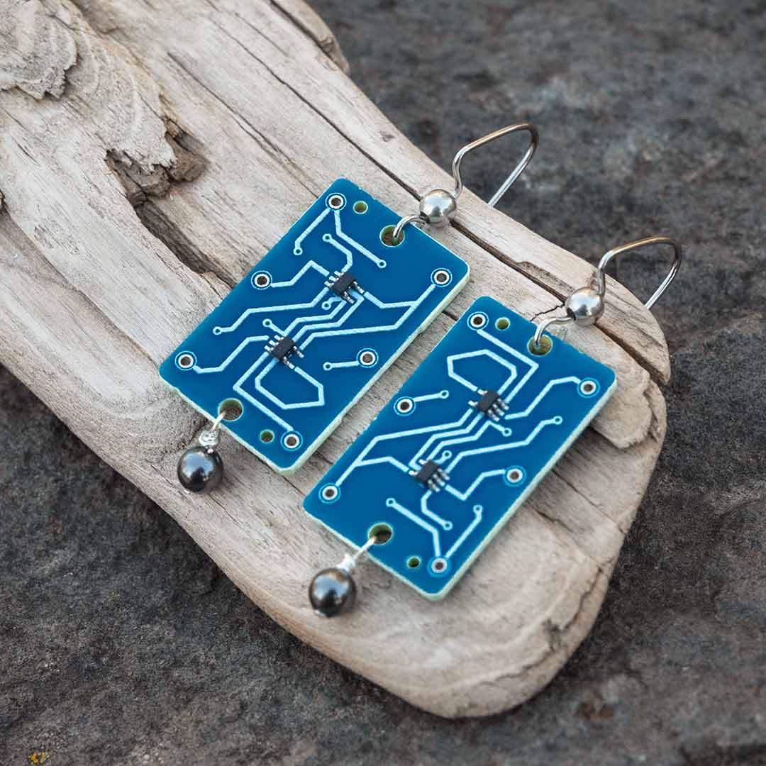 These earrings are more than just inspired by electronics! They are functional circuits, designed by us to authentically represent the foundational concept in computing: memory.