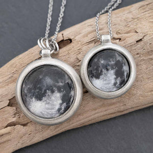These matching moon necklaces are a beautiful way to celebrate timeless connections. Crafted with care and precision, each pendant encases an archival-quality print of the moon under a glass dome secured by a hand-weathered pewter frame and aluminum backing. The reflection of the glass gives the moons a three-dimensional feel.