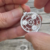 The polished silver steel and gold plated steel pendants measure 1 inch in diameter and are available on a variety of chains and leather cords. Durable and lightweight for everyday wear, this necklace is also stylistically versatile enough to span t-shirts to prom dresses and everything in between. As an extra bonus, the pendant doubles as a satisfying kinetic fidget.