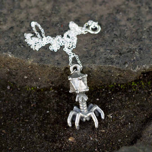 It's not a lunar lander, as other-worldly as it looks. This is a typical T4 enterobacteria phage, carefully crafted from pewter to be an exceptionally detailed, delightfully unusual piece of jewelry. Look closely and you'll see the vertex capsomeres, capsid proteins, whiskers, dsDNA, kneecap domain of long fibers, short tail fibers (spikes/pins), and more. It measures 1 inch high, and comes on a your choice of an 18 inch sterling silver chain or a 24 inch steel chain.