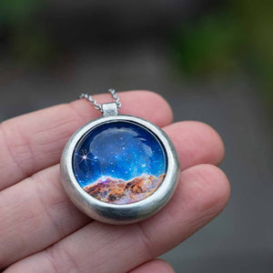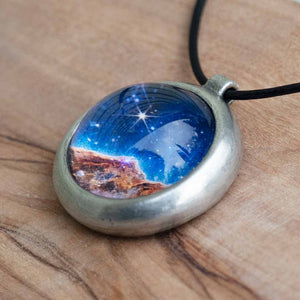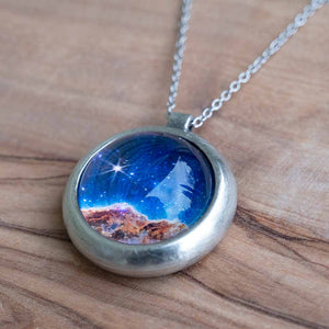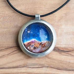 To capture the essence of this stunning nebula in a jewelry design, we have encapsulated the iconic peak from the JWST image under a glass dome and within a hand-finished pewter frame. The geometry of the dome results in the image reflecting in a way that looks three-dimensional, as if the nebula stretches on and on inside the pendant.