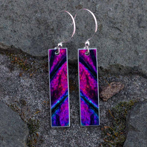 The ear hooks are sterling silver and the earring elements are made from hand-worked metal using an innovative process involving aluminum and high-color images.