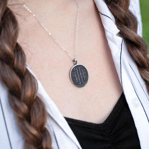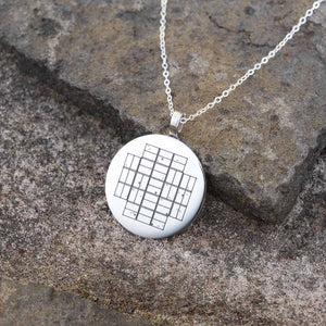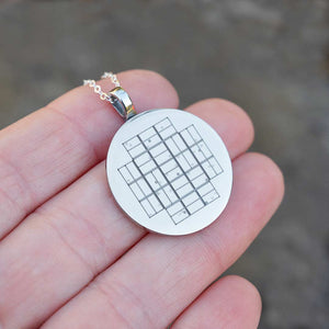 The design is micro-engraved and etched on a 1 inch diameter polished steel disc and hung from your choice of an 18 inch sterling silver chain, 18-20 inch steel chain, or 24 inch steel chain. The necklace comes with a magnifying card and a little printout of the map.