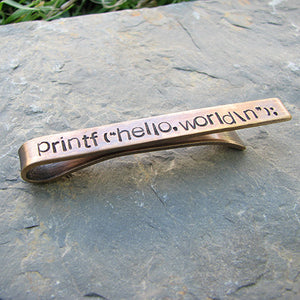 Most tie bars don't compile...but this one does! Here is a "hello, world" program in C that we've had hand-stamped on a beautiful tie bar. Great as a gift or just to say, "You had me at 'Hello, world'."