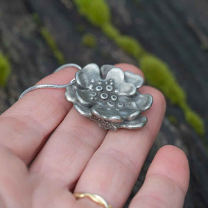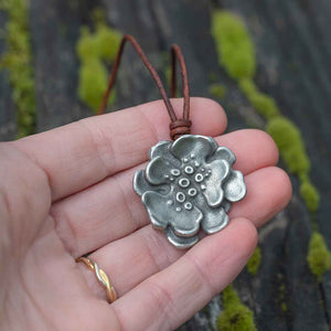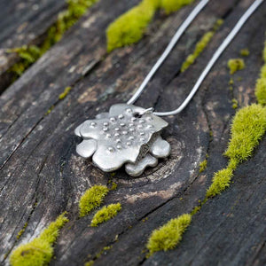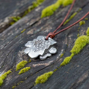 The small-batch cast pewter pendant accurately represents the anatomy of a lichen. On the front is Apothecea, perithecia, and isidia -- several of the lichen's reproductive structures. Part of the lichen is cut-away on the side, allowing you to see the algal cells enmeshed in fungal filaments.