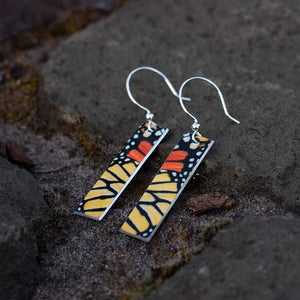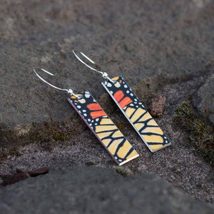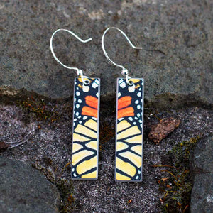 No actual butterflies were harmed in the making of this jewelry -- which is good because the monarch population has been declining for years. Instead, these earrings use high-resolution images of Monarch butterfly wings. The ear hooks are sterling silver and the earring elements are made from hand-worked metal using an innovative process involving aluminum and high-color images.
