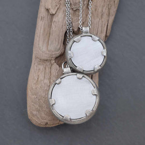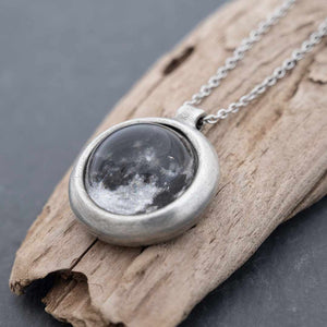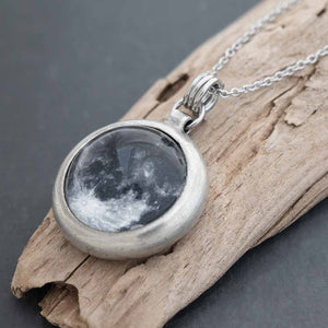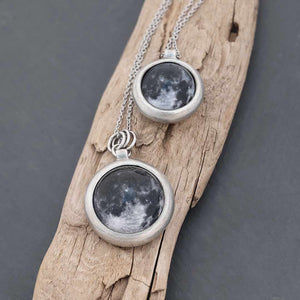 These matching moon necklaces are a beautiful way to celebrate timeless connections. Crafted with care and precision, each pendant encases an archival-quality print of the moon under a glass dome secured by a hand-weathered pewter frame and aluminum backing. The reflection of the glass gives the moons a three-dimensional feel.