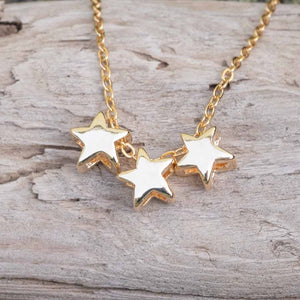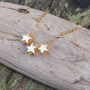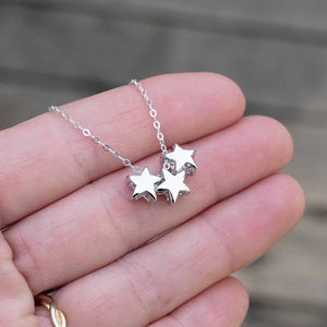 Fancy enough for special events and simple enough for daily wear, this necklace matches everything with its three delicate gold or rhodium plated star-shaped charms dancing cheerfully on an 18 inch gold plated or sterling silver chain.