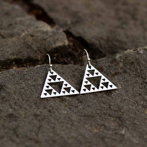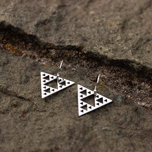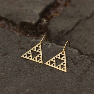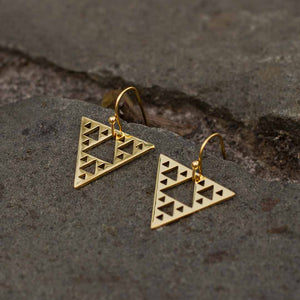 These earrings come in your choice of silver colored polished steel on steel hooks, or gold colored polished steel on gold colored steel hooks. You may also choose the orientation which appeals most to your eye: point up (the traditional Sierpinski Triangle representation)...or point down (adding a touch of Modern Art Deco flair).