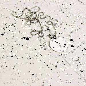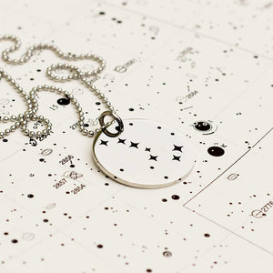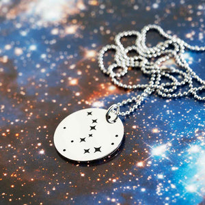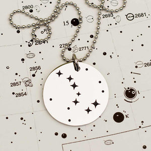 This 1" diameter steel pendant displays the stars in the Big Dipper, as well as several neighboring stars. Being steel, the pendant will never tarnish, and is both beautiful and sturdy. The back of the pendant is blank and can be engraved by professional engravers. (We do not offer engraving in-house at this time.) The pendant is hung from your choice of a 24" steel ball chain or 18" sterling silver chain.