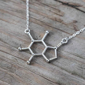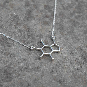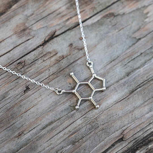 Coffee lover? Dark chocolate? Green tea? Whatever happens to be your caffeine delivery system of choice, this cute caffeine necklace will be a conversation starter. The caffeine molecule is hung from an 18 inch sterling silver chain, with or without a dangling cup charm attached. The caffeine molecule is a lead-free, nickel-free zinc alloy and the cup is made from Tibetan silver.
