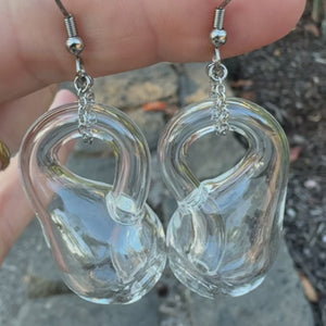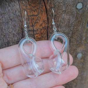 To further enjoy this unique and visually delightful shape, we've made adorable tiny glass Klein bottles earrings! The Klein bottles are handmade from high borosilicate glass and hung from stainless steel ear hooks. Each earring weighs 7g and measures 7cm (about 2.75 inches) from the top of the hook to the bottom of the bottle. They function properly, with a tiny opening all the way through the neck and into the bottle.
