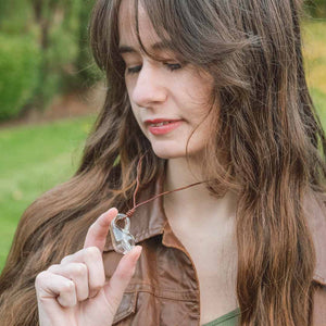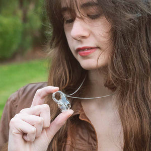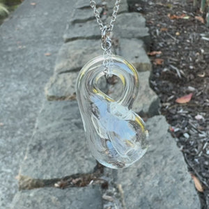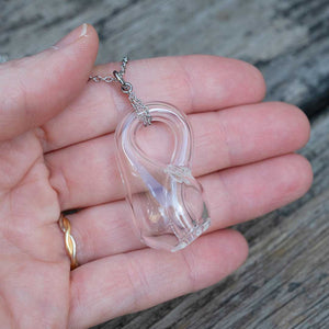 To further enjoy this unique and visually delightful shape, we've made adorable tiny glass Klein bottles necklaces! The Klein bottles are handmade from high borosilicate glass and come on your choice of a 24 inch steel chain, adjustable brown leather cord, or adjustable black leather cord. The bottles measure about 1.5in (~37mm) from top to bottom. They function properly, with a tiny opening all the way through the neck and into the bottle.