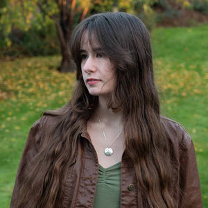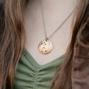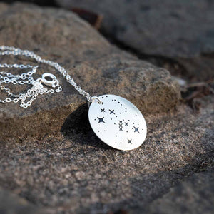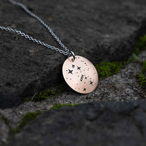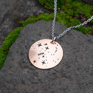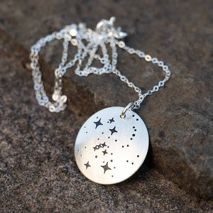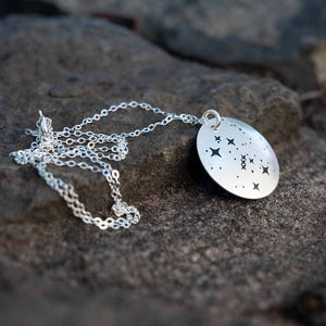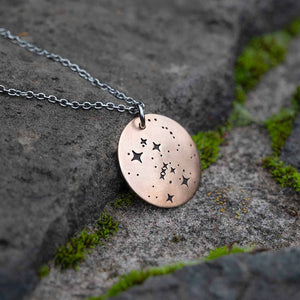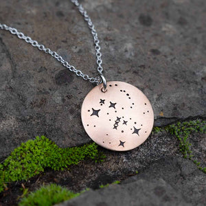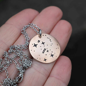 The pendant is hand-stamped in bronze or sterling silver and shaped into a gentle dome. The Orion Nebula is represented by a tiny circle under Orion's Belt. The stars and nebula are accurately placed based on star maps, down to the smallest magnitude we could manage. The pendant measures 7/8 inch in diameter and comes on a steel or sterling silver chain.