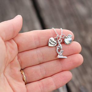 An exceptional science teacher can open up grand vistas of interest and inquiry for their students. Say thank you to the teacher in your life with this sweet, unique necklace. It features a delicate apple, a silver microscope, and a "thank you" heart charm on an 18 inch chain. Great for end of year gifts and holidays.