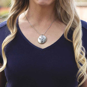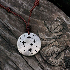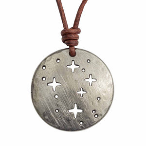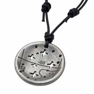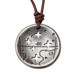 The pendant is small-batch cast from pewter and has been hand hammered and weathered for an antique look. The stars are accurately placed, based on star maps, and are cut all the way through the pendant, down to the smallest magnitude we could manage. The back features the right ascension and declination, reversed to match the stars. It also marks the boundary of the Coalsack Nebula, the most prominent dark nebula in the night sky. The pendant measures 3cm in diameter and comes on your choice of a steel snake chain and an adjustable black leather cord.